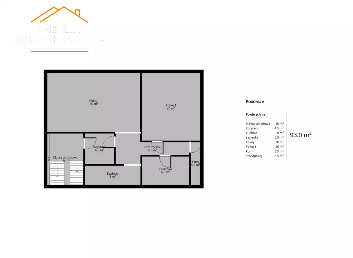 – Dom o powierzchni użytkowej około 280m2, składający się z piwnicy, parteru, 1 piętra oraz poddasza.
